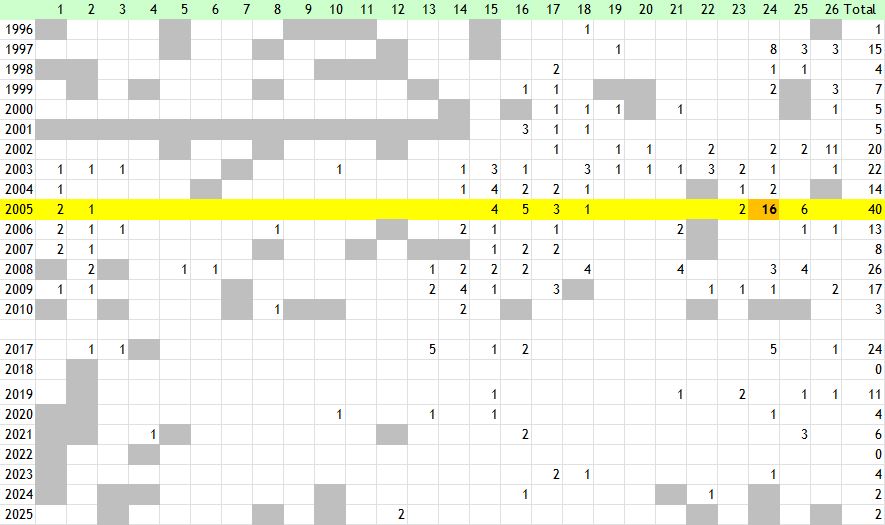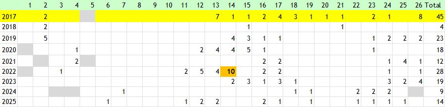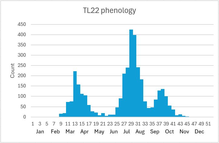 As shown on the map, the Comma is widely distributed in the Stevenage area. It is never seen in great numbers with only a few visits yielding more than a dozen specimens but numbers have increased in the last few years. 2017 was the best year in terms of abundance with 336 inviduals counted and the most reports occurred in 2020 with 181. Knebworth Park and Fairlands Valley Park appear to be the best places to find the butterfly. On 10 July 2023, a record count of 22 individuals were seen in the Knebworth Woods area during a Wider Countryside Butterfly Survey. 2023 and 2024 had poor starts in terms of numbers and although numbers rose in the late summer of 2023 they did not in 2024.