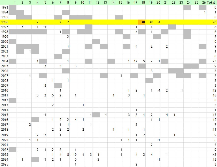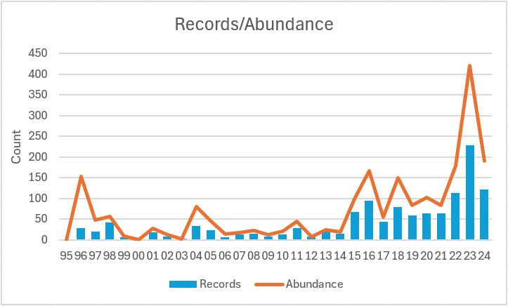 As shown on the map, the butterfly is well distributed in the Stevenage district. 2023 was a very productive year with 227 reports, a record for the TL22 square. Despite a reasonable start in 2024, numbers plummetted in the latter half of the year.