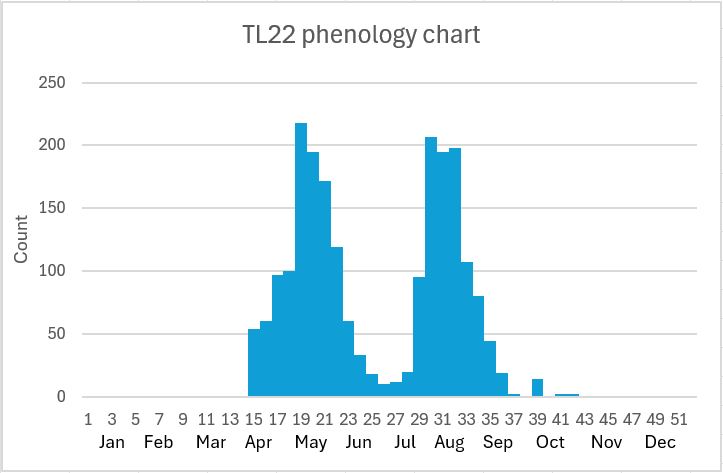The chart shows that the second brood may be larger but the last few years have indicated that both main broods are broadly similar in abundance. Eggs are laid singly on