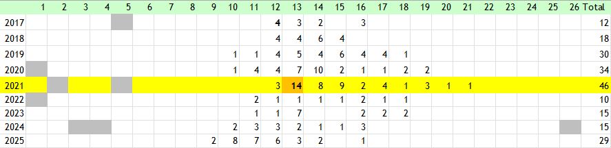 Earliest date: 16 May 2002 at GSK, Stevenage Latest date: 28 August 2013 at Great Ashby Park