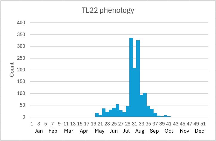 As indicated on the map, the butterfly is well distributed in the Stevenage area. The best year in terms of abundance in the area was in 2006 when high numbers were reported in late July and early August: 100 at Great Ashby Park on 24 July and 89 at Fairlands Valley Park on 29 July. The best count, though, was 128 on 6 August 2009 at Great Ashby Park. More than 100 reports came in for 2019, easily the highest on record, but none yielded more than eight individuals. Only 14 reports were received in 2024 and two of those were for specimens seen in October, unusually late in the season.