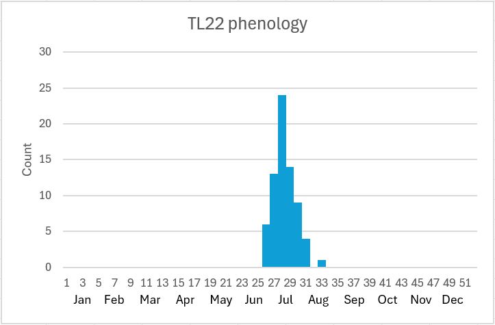generation a year is produced with emergence from the first week of July until early August. The peak of abundance is usually around the 10th of July.