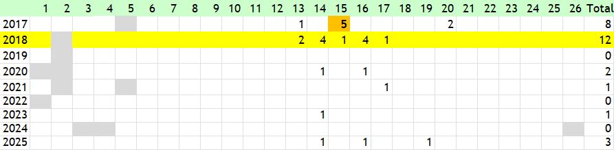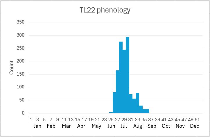 The Purple Hairstreak occurs mostly in the wooded areas around Stevenage and is most abundant in the Knebworth Woods complex where the large majority of sightings are recorded. The highest count was recorded there on 24 July 2004 and on 12 July 2018 when an estimated 100 were seen which accounts for a slightly uneven distribution of abundance on the phenology chart. It is under-recorded and it is possible that every mature oak tree in our area will support colonies. In the current 5-year cycle (2020-2024) first-ever known records came from the far west (TL22C and TL22D) which is predominantly agricultural land. 2018 was an exceptional year at the Knebworth Woods complex - see below for transect results. 2024 was the worst year since 2012, with only seven reports, one of which recorded five specimens during a Wider Countryside Butterfly Survey in the Knebworth Woods complex on 27 June.