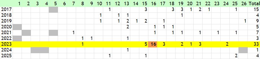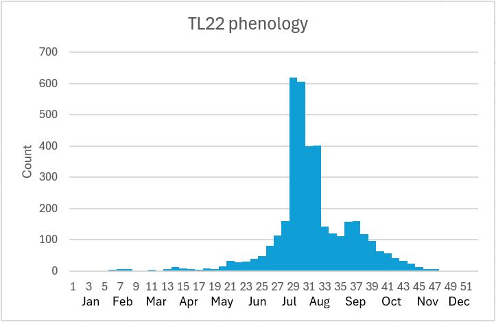 As indicated on the map, the butterfly is well distributed in the Stevenage area. The highest populations recorded were in Old Stevenage: 17 at St. Nicholas Churchyard on 14 September 2011 and 15 at Great Ashby on 4 August 2021. The map shows that the TL22L tetrad harbours the largest total because proportionately many more visits were made to this tetrad over the whole survey period. 2023 was easily the best year for number of reports (420) with the highest ever counts too including 46 in central Stevenage on 16 July.