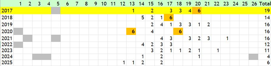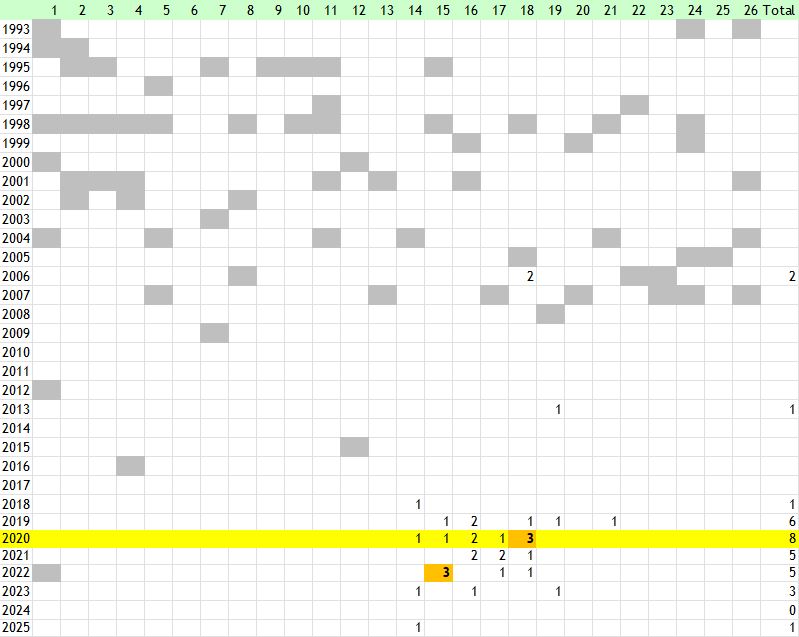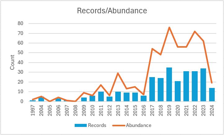 As shown on the map, the Silver-washed Fritillary is more frequently found in the south-western part of the Stevenage area, especially the Knebworth Woods complex. The first record was from The Node, north of Codicote on 15 July 1997 but the next was not received until August 2004 when several were seen at the Knebworth Woods complex plus one surprisingly at Frogmore Gravel Pit. I found one in Whomerley Wood and Canyon Field (as it was then known) on 29 July 2006 and another was seen at Great Ashby Park on 8 August in the same year. Don Gregory saw a specimen at Astonbury Wood on 3 July 2007. Since 2009, it has regularly been seen around Watery Grove with the best year in 2013 when it was common. Records have been received from Great Ashby Park in four of the last six years. More than 20 reports were submitted each year since 2017 (by far the highest on record), mostly owing to increased recorder effort through transects and the Wider Countryside Butterfly Survey. Abundance have dropped slightly since 2019 but first-ever known reports arrived in the far north of our area for TL22E (Wymondley Woods in 2020) and TL22U (Weston village in 2021). The butterfly was slightly less common in 2023 although the highest ever count of 17 was recorded on 10 July in the Knebworth Woods complex during a Wider Countryside Butterfly Survey. A further drop in numbers in 2024 made it the worst year since 2015 with only 14 reports of 19 individuals in total.