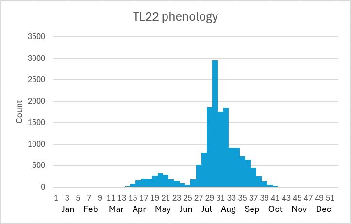 The Small White is a widespread and common butterfly throughout Britain boosted by immigrants from Europe. It appears that the butterfly did not suffer as badly as the Large White after the last war by the increased intensification in agriculture and pesticide use. It was found that application of pesticide, DDT, killed off an increased number of larval predators such as ground beetles and harvest spiders resulting in an increased number of larvae later in the season (Heath et al.). Numbers have dropped by about a quarter since 1976 but have stabilised since 2009 in spite of a poor run prior to 2018 which was a spectacular year for the butterfly (Brereton et al.). In Hertfordshire and Middlesex, only since 2011 has the Small White recovered up to the level of the mid 1990s in terms of abundance which may be due to the heavy presence of oil-seed rape in the county (Wood, 2012). However, numbers have fallen in the last few years with 2024 probably one of the worst on record.