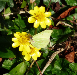 Double figures!. Full sun and 14? in our Harpenden garden brought out the first Brimstone (and first butterfly) of the year: an event we traditionally celebrate with a bottle of fizz. This pioneer was followed by no fewer than thirteen more Brimstone fly-throughs. These sightings were both welcome and unexpected, coming after a dreadful autumn for garden butterflies and the dullest of winter birding (no blackcaps, redpolls, siskins, redwings, fieldfares or bramblings in our garden). Plenty of bees and several ladybirds about today, too. [Posted by Alan Jackson]