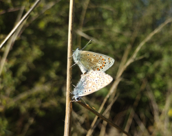 Adonis Blues still on Therfield Heath. Two fresh male Adonis Blues were seen this morning on the Old Rifle Range, along with several rather tatty females (some of which may have been female Chalk Hill Blues, although no males of this species were seen). At least one female Common Blue and several Meadow Browns were recorded, whilst Speckled Woods and a mating pair of Green-veined Whites were seen just off the heath. Relatively speaking, this has been an excellent year for Small Copper butterflies on the heath, with double figure numbers recorded in late August (normally I only see one or two individuals per year). However, unfortunately Wednesday's monsoon seems to have done for them. [Posted by Martin Johnson]
