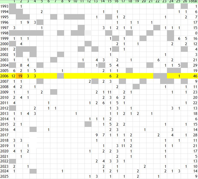 As shown on the map, the Comma is widely distributed in the Stevenage area. It is never seen in great numbers with only a few visits yielding more than a dozen specimens but numbers have increased in the last few years. 2017 was the best year in terms of abundance with 336 inviduals counted and the most reports occurred in 2020 with 181. Knebworth Park and Fairlands Valley Park appear to be the best places to find the butterfly. On 10 July 2023, a record count of 22 individuals were seen in the Knebworth Woods area during a Wider Countryside Butterfly Survey. 2023 and 2024 had poor starts in terms of numbers and although numbers rose in the late summer of 2023 they did not in 2024.