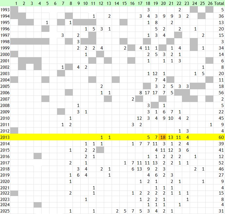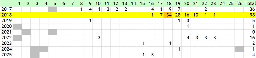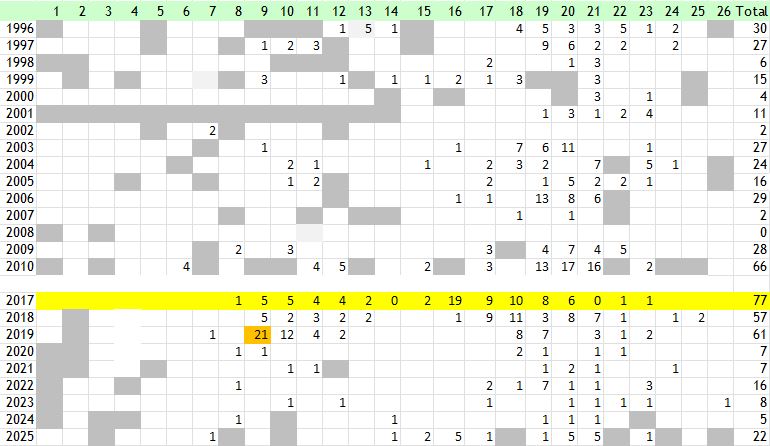 Most records so far are of singletons: 2003 (1 record), 2004 (2), 2005 (1), 2010 (3), 2016 (3), 2017 (1), 2022 (1) but in