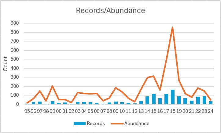 specimens seen and in 2024 not one site yielded more than 5 specimens on any one visit.