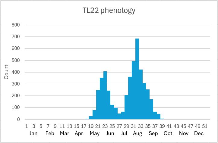 week of May and first week of June for the first brood, and early to mid August for the second generation. The 24 October sighting in 2018 is the latest