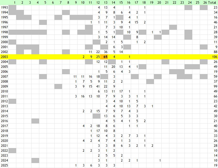 Earliest date: 16 May 2002 at GSK, Stevenage Latest date: 28 August 2013 at Great Ashby Park