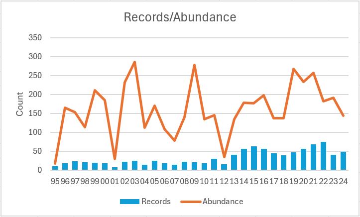 taller grassland. Numbers have been relatively stable in the last few years unlike the decline of the other golden skippers although 2024 saw a slight fall in numbers.