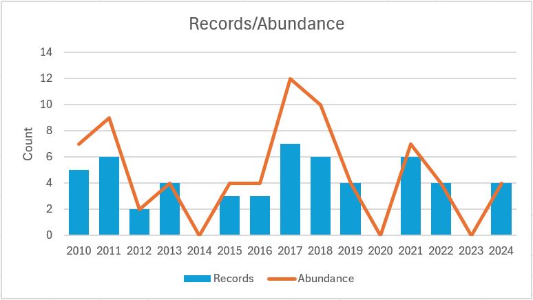 The first record in the 1995-2023 survey came in 2010 although it is possible that the Purple Emperor was in the Knebworth Woods area earlier during the survey period for the reasons cited above. On the other hand, the butterfly might have just (re-)colonised the area as part of an ongoing expansion. Regular sightings near Rusling End and at Watery Grove since the beginning of the decade, suggest that at least one colony is surviving in this part of the county. Being a mobile species, it can be seen well away from its breeding grounds, for example, at Weston and Walkern as indicated on the map. In 2018, one was seen at Shephall on 27 June. The meadow at Norton Green Common is one of the best spots to find the butterfly and the open area outside Pigeonswick Cottage is also worth investigating. In 2017, since the new public footpath was established around the eastern side of Knebworth Park, I found some specimens on the tree-tops along the woodland edge, so an area worth exploring further. Following Don Gregory's sighting on 18 July 2021 on the northern edge of Whomerley Wood (first ever reported from the site) I found one at the same spot on 21 July. A female was feeding on buddleia in a garden at Brookhill, Stevenage (TL22K) on 29 July 2022. Unfortunately, there were no reports of this species in 2023 but four reports of single individuals arrived in 2024, all in the south western part of the TL22 square. None of the transects in the TL22 decad yielded any records of this butterfly.