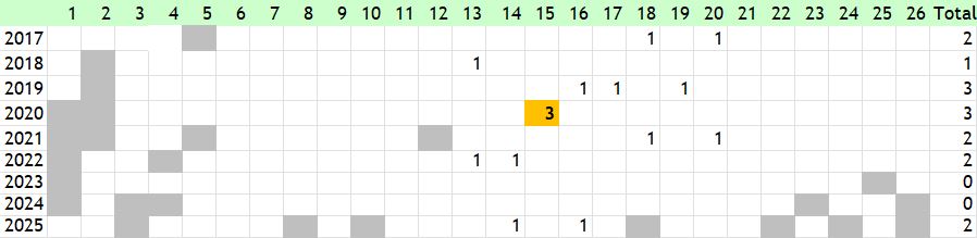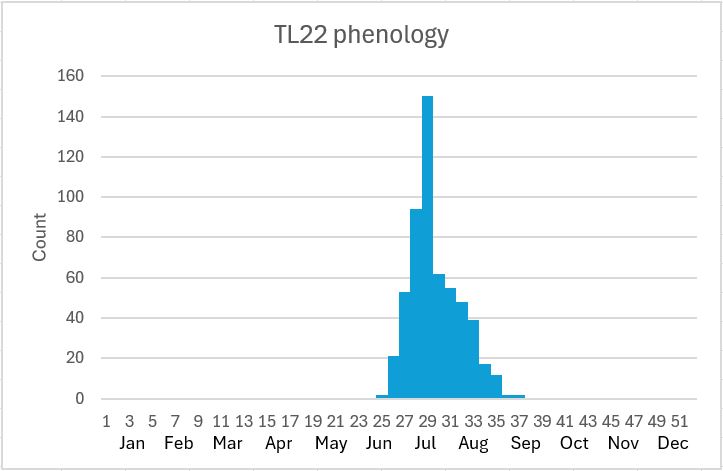 As shown on the map, the Silver-washed Fritillary is more frequently found in the south-western part of the Stevenage area, especially the Knebworth Woods complex. The first record was from The Node, north of Codicote on 15 July 1997 but the next was not received until August 2004 when several were seen at the Knebworth Woods complex plus one surprisingly at Frogmore Gravel Pit. I found one in Whomerley Wood and Canyon Field (as it was then known) on 29 July 2006 and another was seen at Great Ashby Park on 8 August in the same year. Don Gregory saw a specimen at Astonbury Wood on 3 July 2007. Since 2009, it has regularly been seen around Watery Grove with the best year in 2013 when it was common. Records have been received from Great Ashby Park in four of the last six years. More than 20 reports were submitted each year since 2017 (by far the highest on record), mostly owing to increased recorder effort through transects and the Wider Countryside Butterfly Survey. Abundance have dropped slightly since 2019 but first-ever known reports arrived in the far north of our area for TL22E (Wymondley Woods in 2020) and TL22U (Weston village in 2021). The butterfly was slightly less common in 2023 although the highest ever count of 17 was recorded on 10 July in the Knebworth Woods complex during a Wider Countryside Butterfly Survey. A further drop in numbers in 2024 made it the worst year since 2015 with only 14 reports of 19 individuals in total.