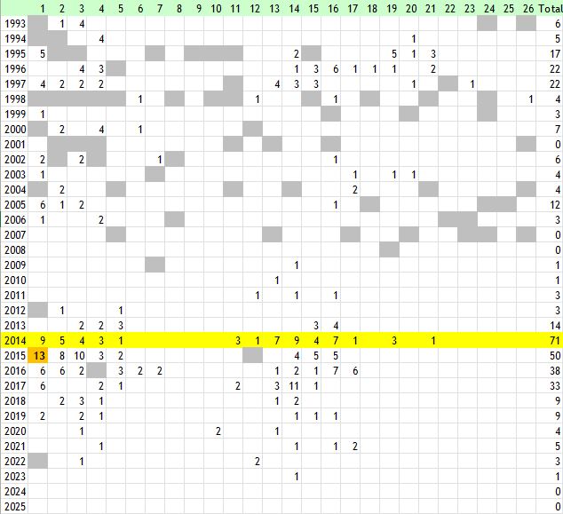 As shown on the map, the butterfly occurs all over the Stevenage area. 2004 was an extraordinary year around Burleigh Farm and Graffidge Wood where Ken King counted over 250 in July but generally 2014 was found to be the best year during the survey. The largest populations were found in Great Ashby Park, where 53 specimens were recorded on 16 June. The vast majority of visits until 2014 yielded single-figure counts when 30 years ago, finding dozens would be a common occurrence in season. Numbers have dropped significantly each year since 2014. 2024 appeared to have been the worst on record with only 27 reports of 47 individuals and 12 of those occurred on one visit at Canterbury Way Park on 14 July. No reports received in the autumn as is mostly evident in the recent past which suggest the butterfly is now entering hibernation early and skipping a generation.