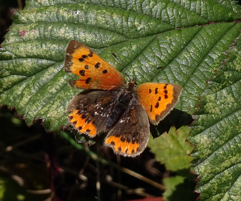 Sightings from Stanwell Moor. A very sunny morning locally, but much colder (only 8 degrees at noon). However, on the sheltered brambles next to Hithermoor Lake I found firstly a fresh-looking Red Admiral, and then more surprisingly a rather worn male Small Copper. I don't find many of the latter species in this spot, so I'm pretty sure this is the one I saw here on 28th October (but curiously not since then...). Regardless of that, this is my latest ever Small Copper sighting. [Posted by Dave Miller]