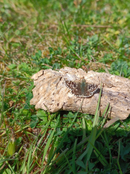 Grizzled Skipper at Waterford Heath. Popped into Waterford Heath today before the big shop. Whilst I scoured the East bank of the South Heath from the path hoping for a sighting, my daughter who is seven went with her mum to do a loop around. I didn't see any Grizzled Skippers the entire walk (very dry) but my daughter was extremely smug as she had found one basking amongst a large patch of Ground Ivy, SW side near the small exposed steel pipe. Mum helping to provide the photographic proof. [Posted by Nathan Ellis]