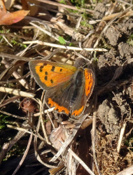 Sightings from Stanwell Moor. An even chillier start to the day for me today, but once again there was some early sunshine - enough to bring a few butterflies out. Two Red Admirals and a Comma were probably individuals I'd seen in recent days, but the Small Coppers were more interesting. I found three in one spot - I think I may have seen them all before, but never more than two at once. However, close scrutiny of the photos revealed three different individuals. I also found another one in a completely different spot, but didn't get a photo unfortunately. The weather is now set to become warmer again, with at least a bit of sunshine, so hopefully the season will continue for a few days longer. [Posted by Dave Miller]